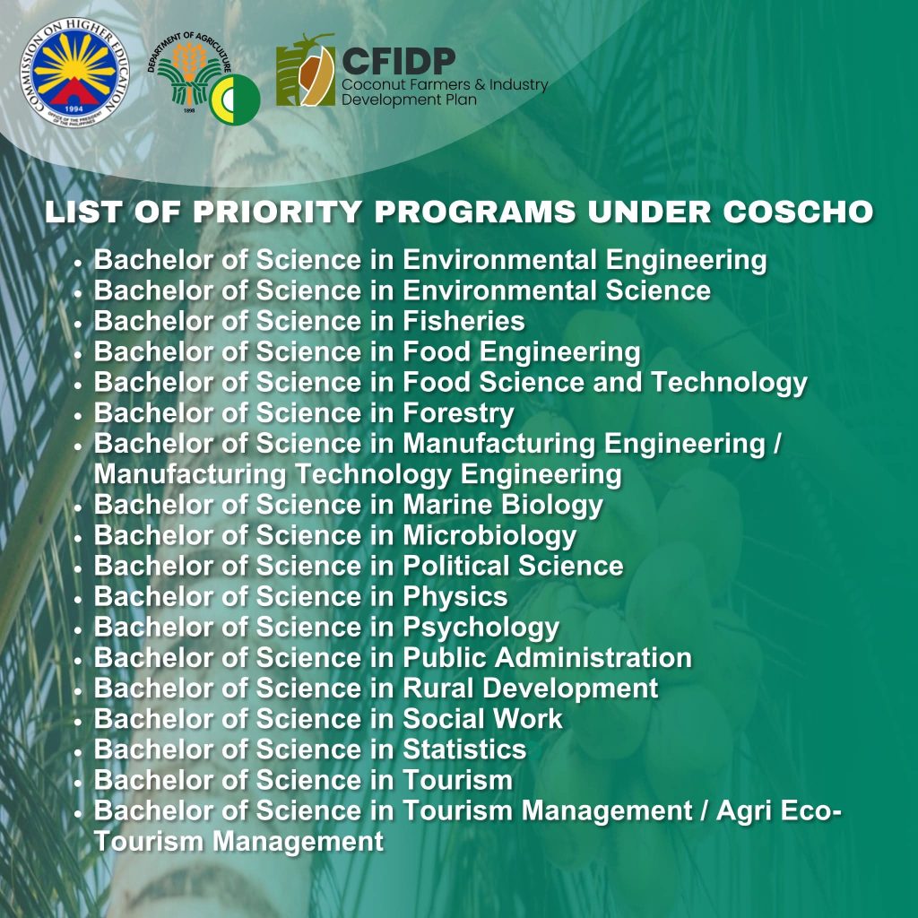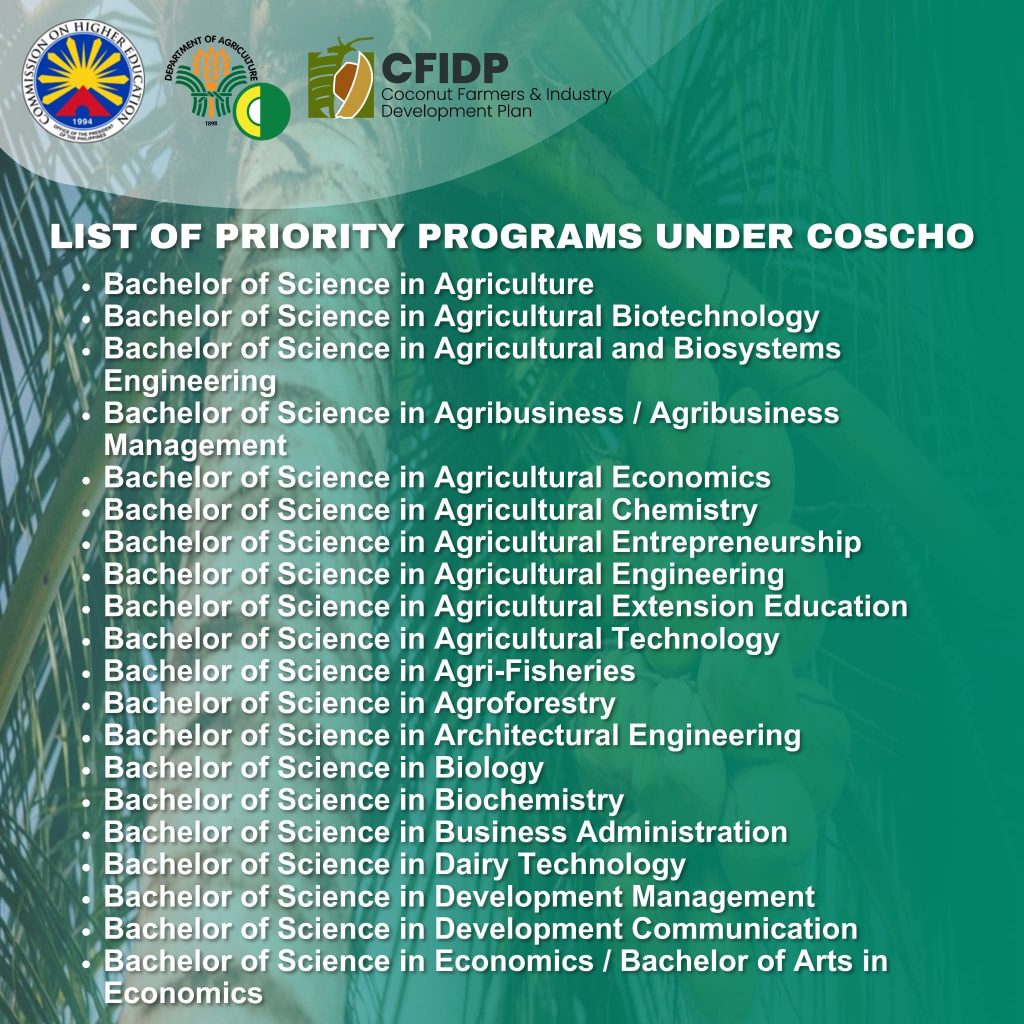 The Scholarship Program for Coconut Farmers and their Families (CoScho) is a government initiative that provides full support for college education to qualified coconut farmers and their dependents. It was created under the Coconut Farmers and Industry Trust Fund Act (RA 11524), and is jointly implemented by the CHED and the PCA.