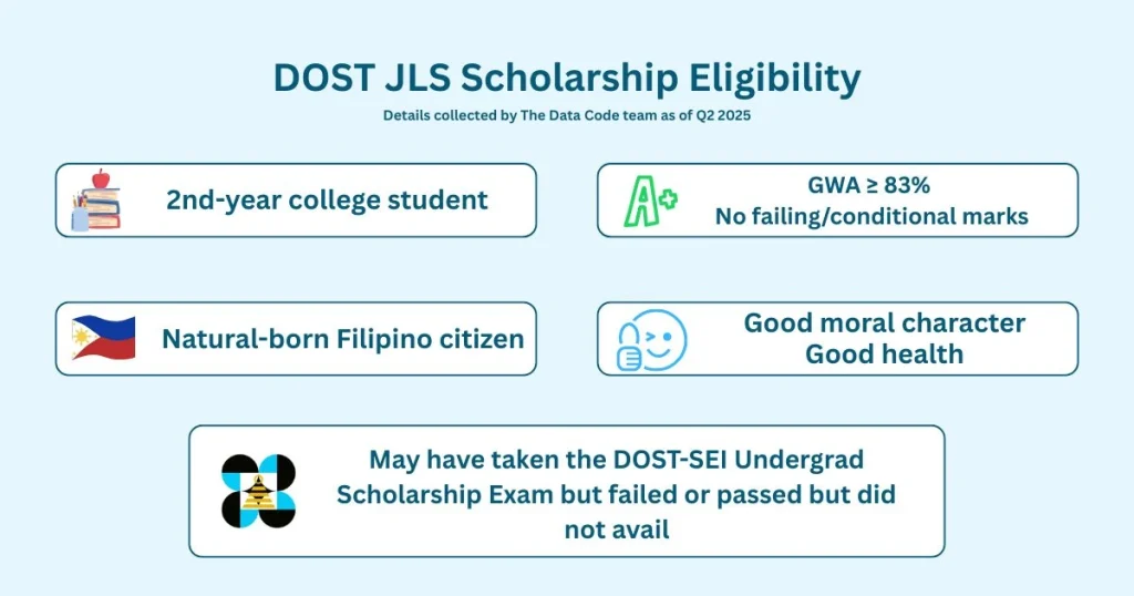 The JLSS is open to Filipino students currently enrolled in a DOST-accredited university, pursuing an S&T degree identified as a priority field.