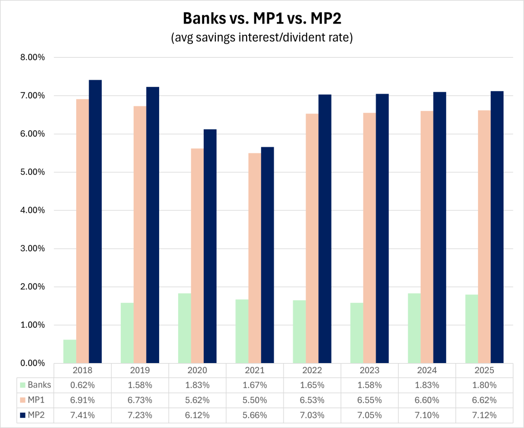 On top of MP1, MP2 has paid even higher, ranging roughly from 6% to ~7.4% from 2018 to 2025.