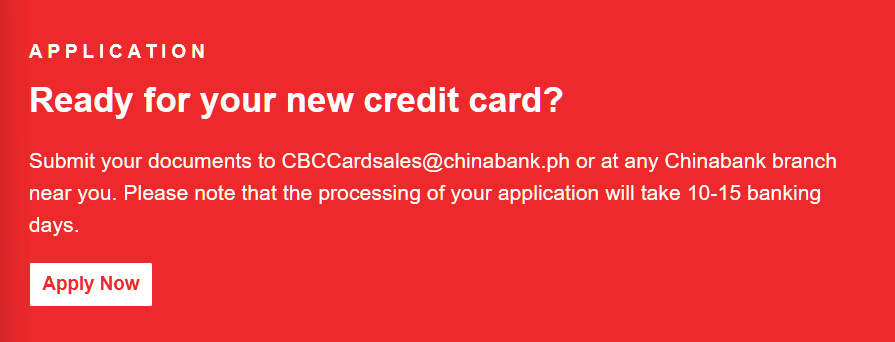 Applying for a Chinabank credit card is an easy process that you can finish completely online. To start, click on the application link of your preferred card and review the requirements. Once ready, look for another Apply Now button which will take you to the application form.