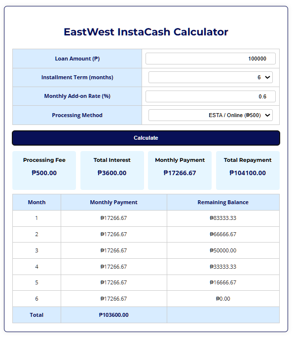 Access the EastWest InstaCash calculator here.