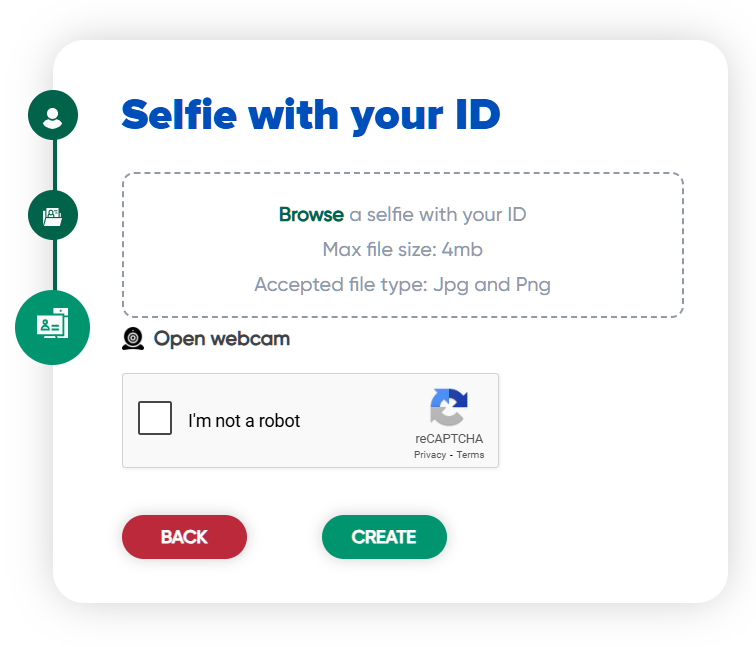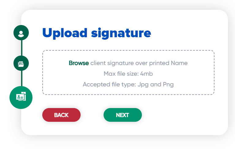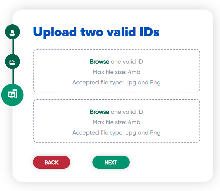 5. Prepare and upload your documents: a photo of your signature over your printed name, two valid government-issued IDs, and a selfie holding your ID.