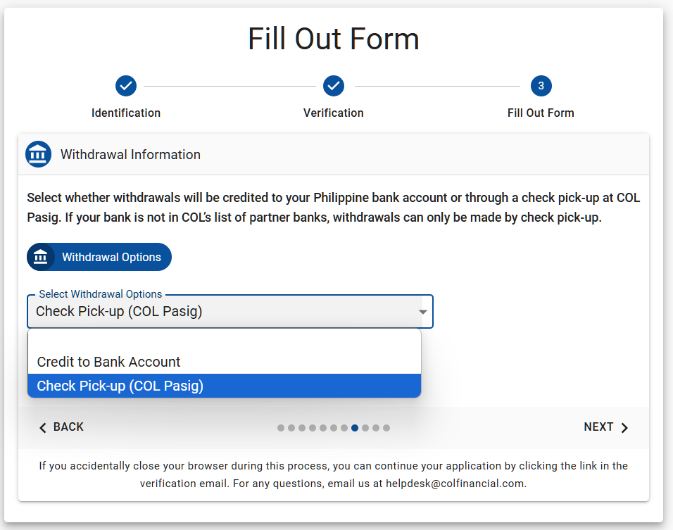 5. For withdrawal options, you can choose to have funds deposited into your bank account. You have to provide your bank details for this option. You can also opt for a check pick-up at the COL office located in Pasig City.