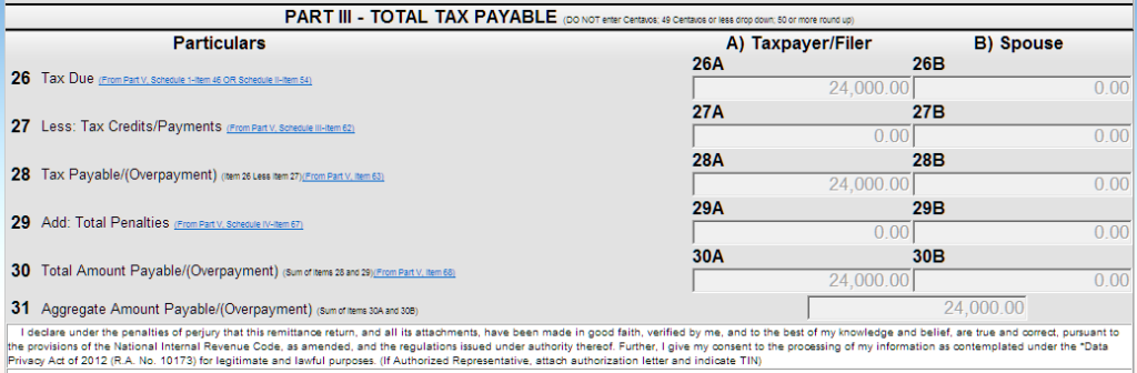 Submitting a form doesn’t automatically mean your taxes are paid. In each form, there is a section that automatically calculates your tax due. For example, the image below shows the tax payable when using Form 1701Q: